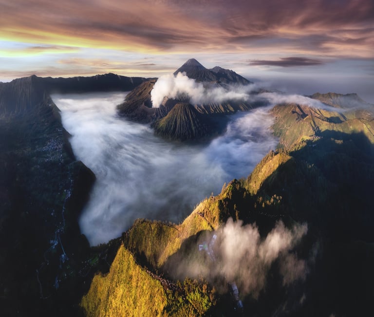 At the edge of dawn, Mount Bromo awakens like a forgotten god rising from ash and mist—this is where the journey of exploration begins. A sea of clouds drifts in silence as golden light slowly reveals a timeless landscape. Every frame feels powerful, raw, and eternal. This is not just a destination—it’s a statement that you’ve stepped into something greater than yourself.
