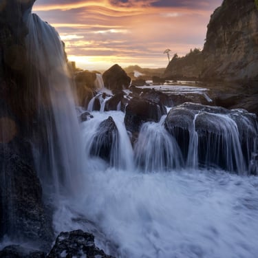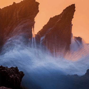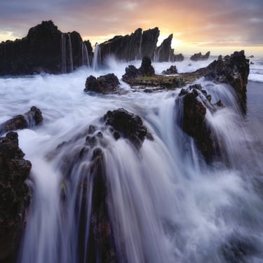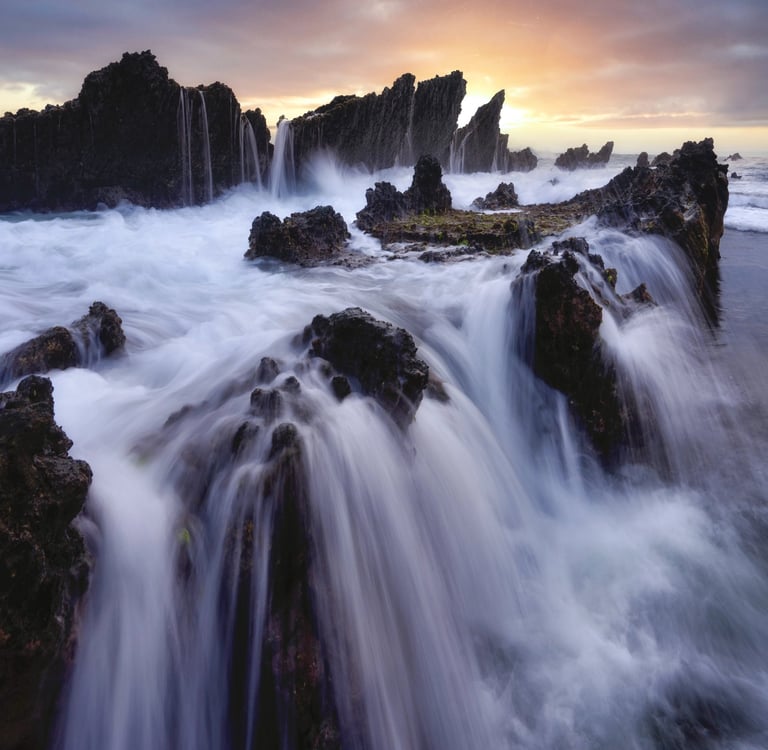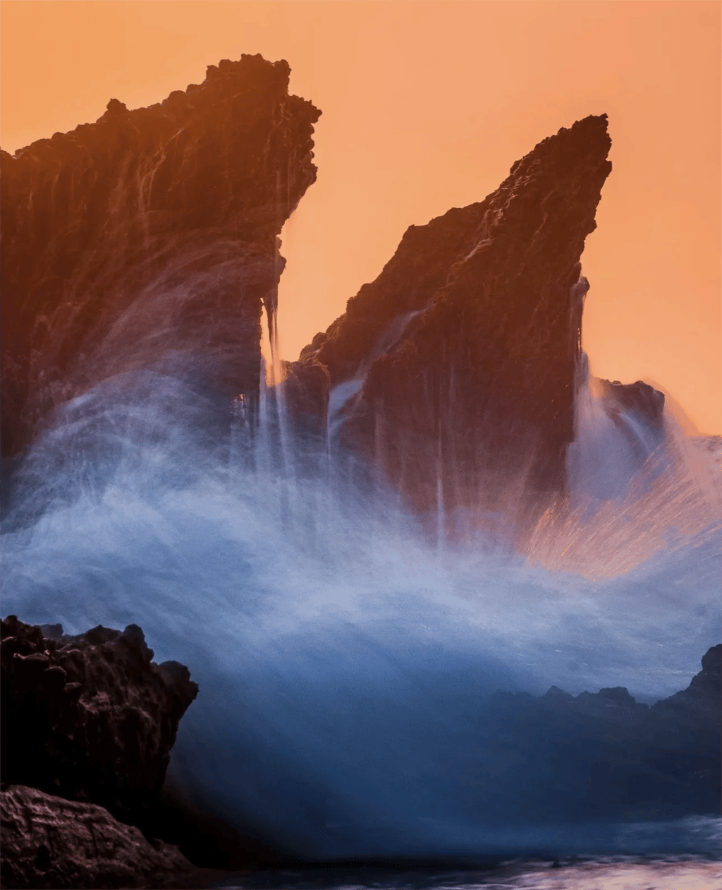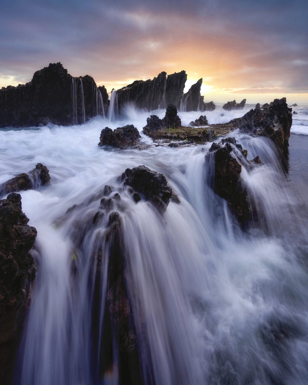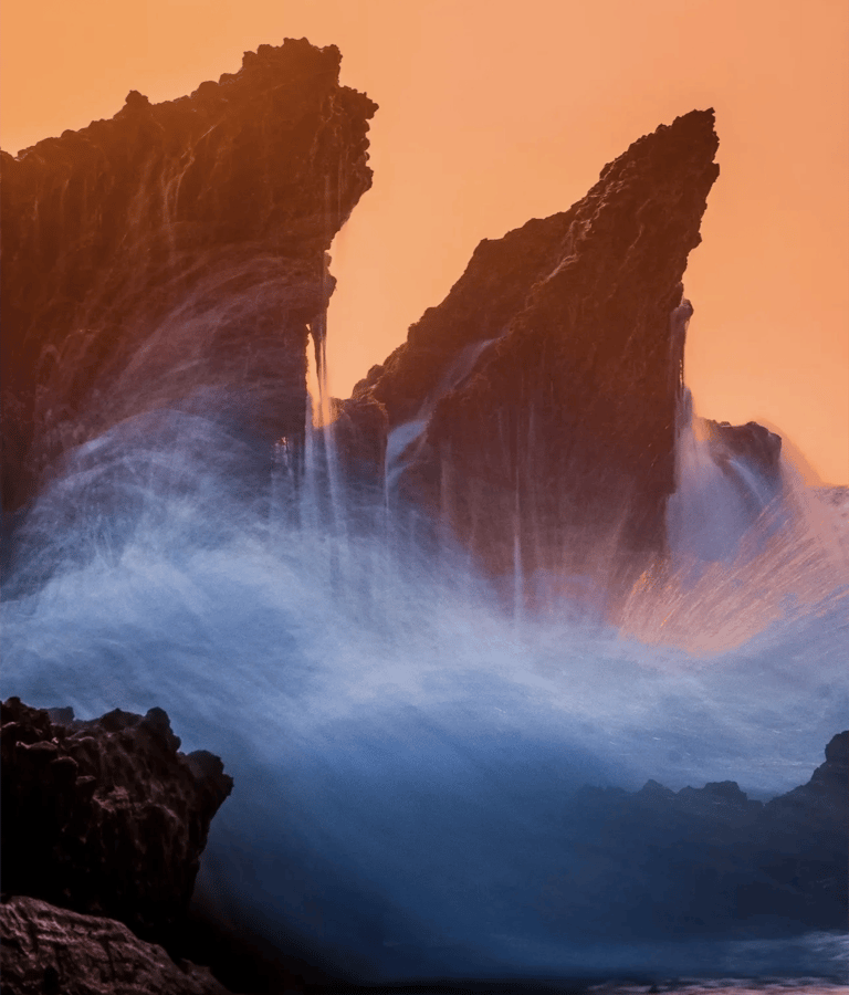 Waves collide with layered rock formations, creating a dynamic and ever-changing foreground. The energy here is raw—less controlled, more instinctive.