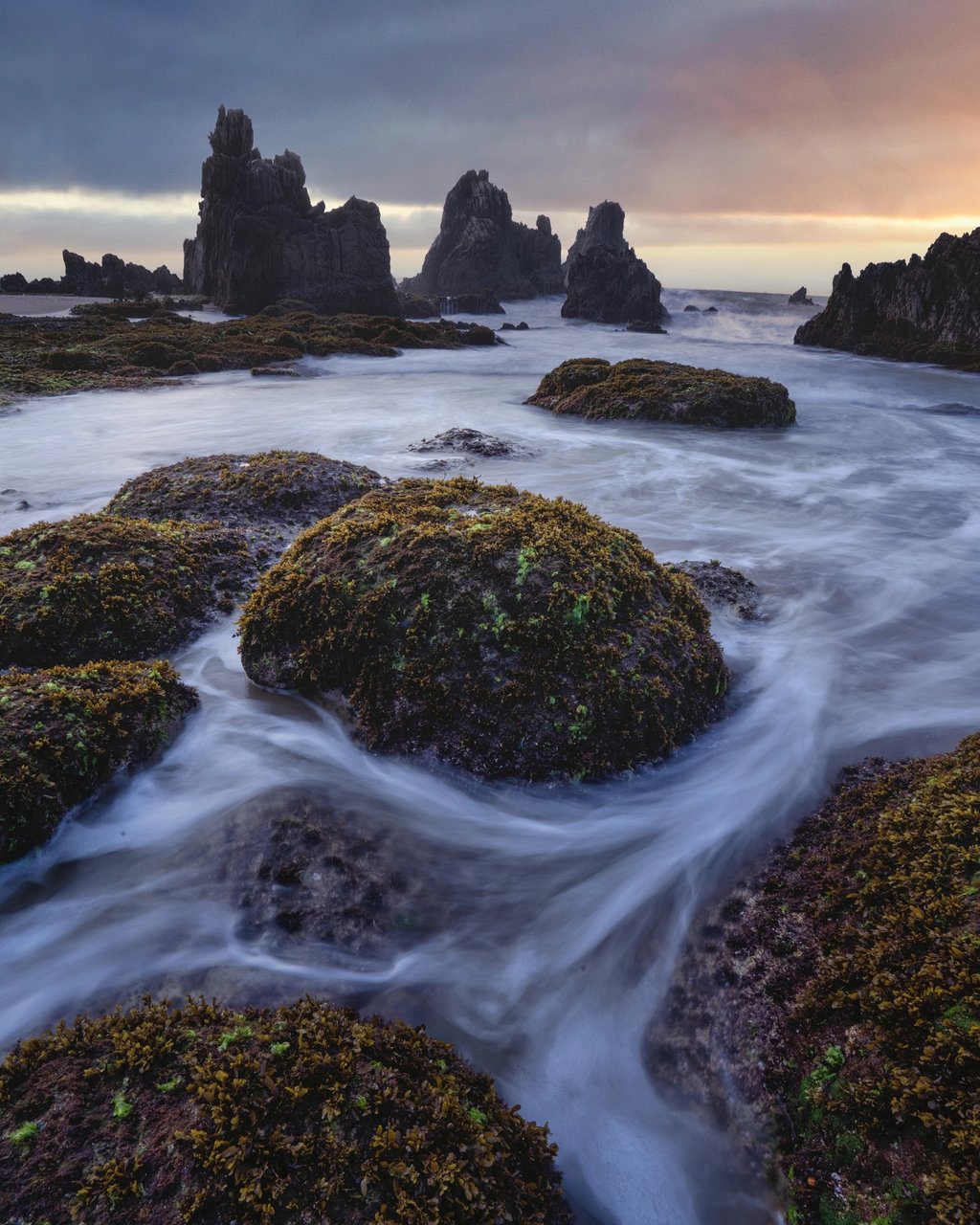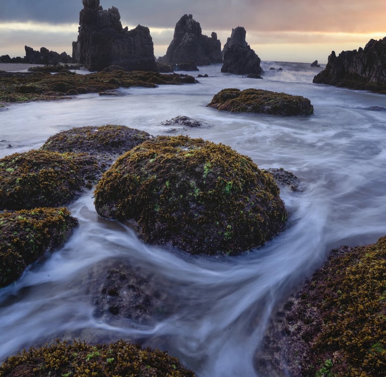 Here, iconic rock formations rise from the shoreline, creating strong silhouettes against the fading light. As the sun sets, the scene becomes graphic and bold.