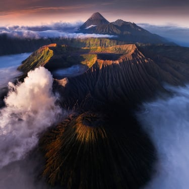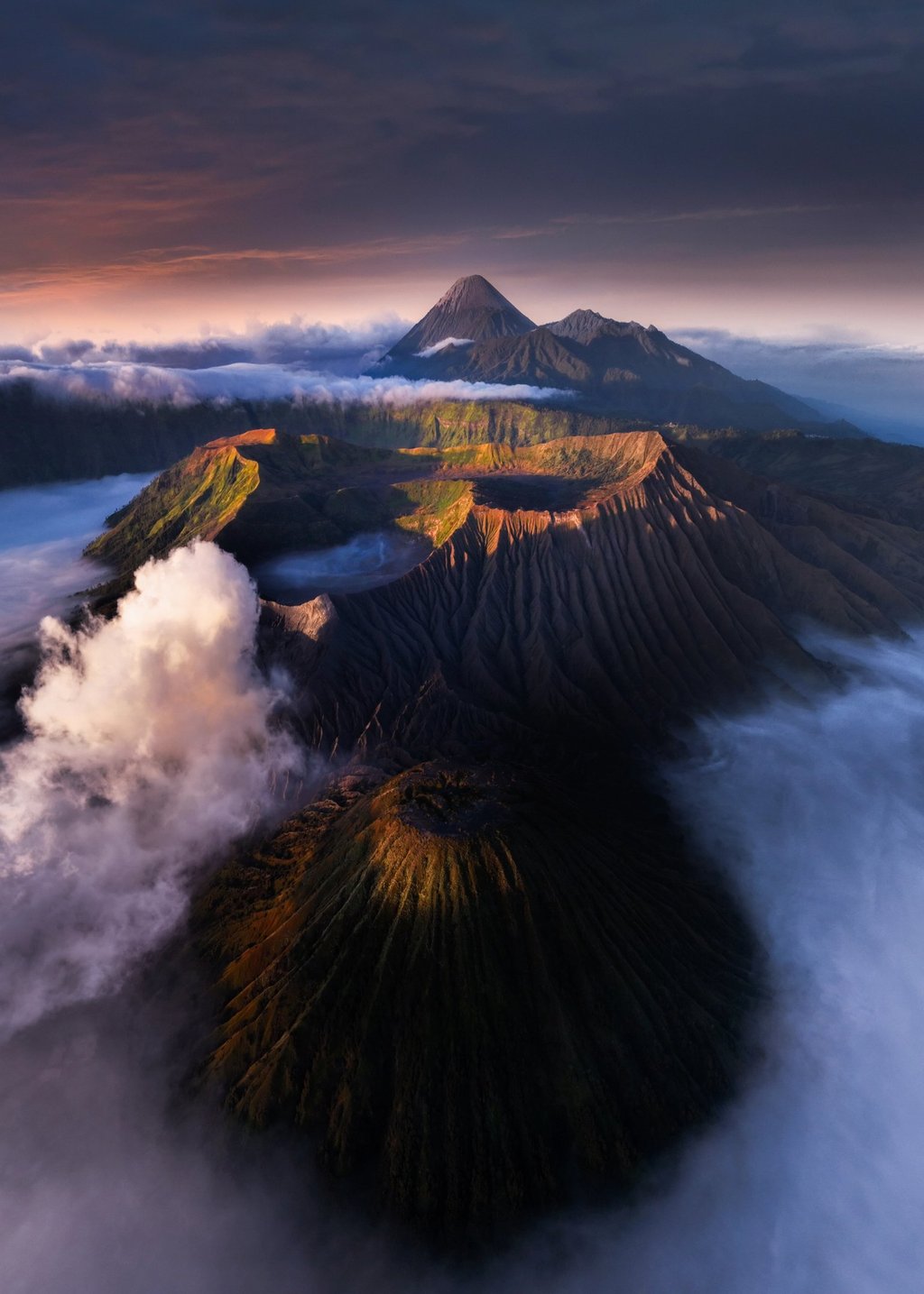 As light slowly reveals the landscape, depth begins to unfold—layers of mountains, mist, and volcanic forms stretching into the distance.