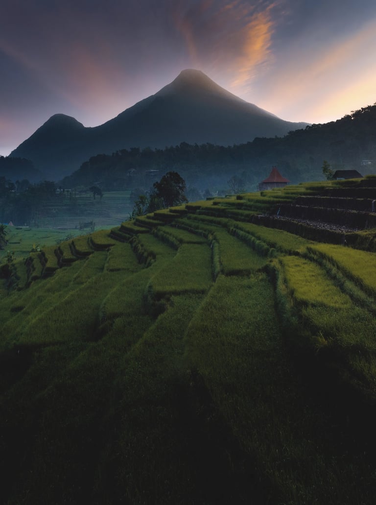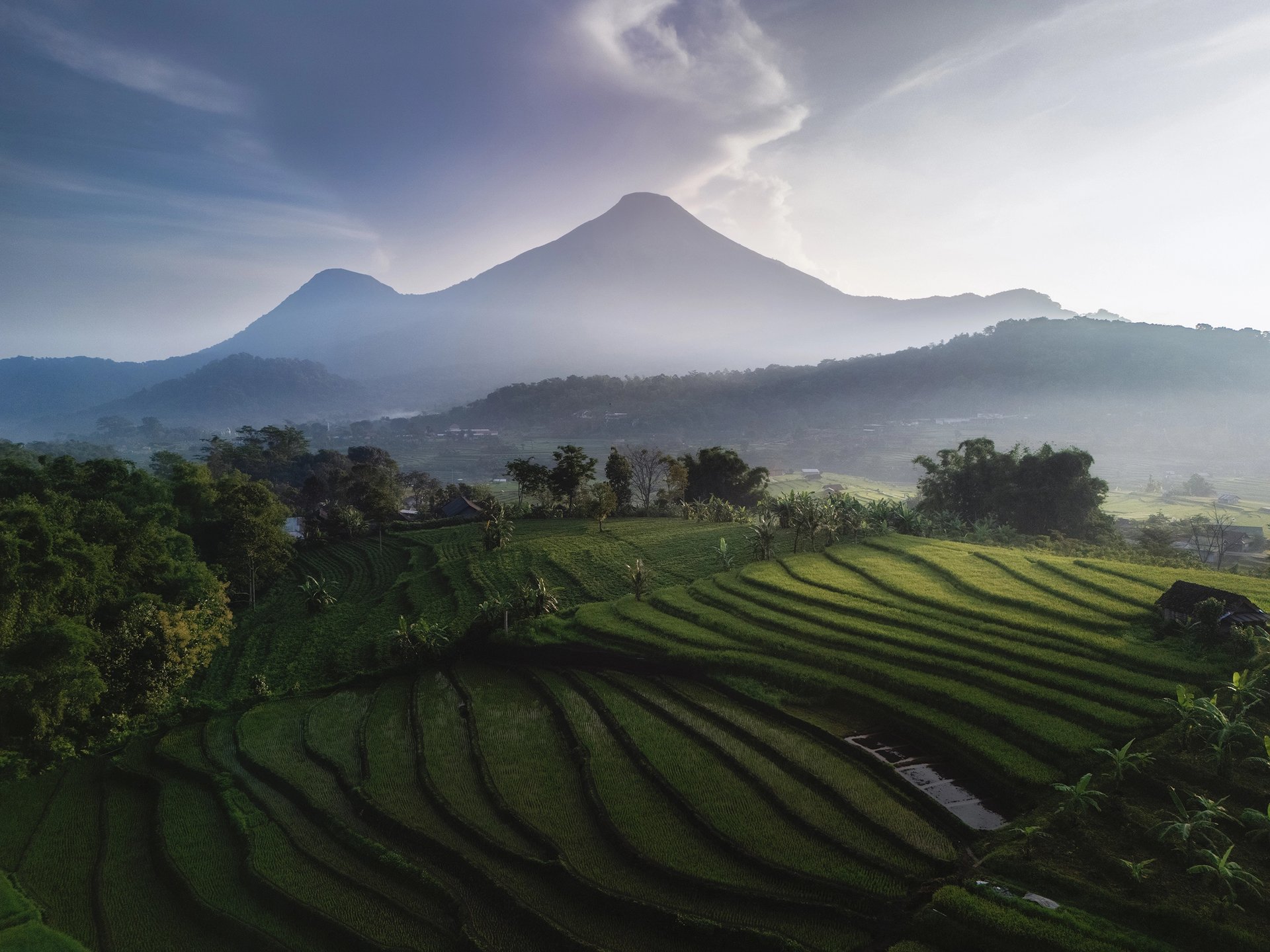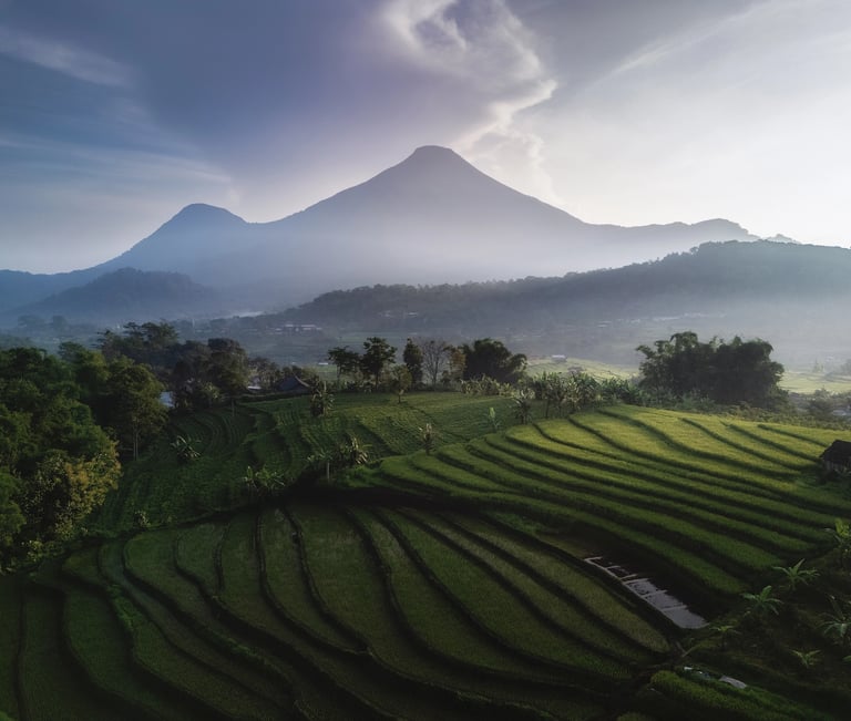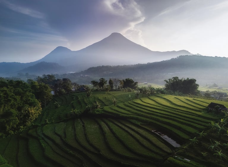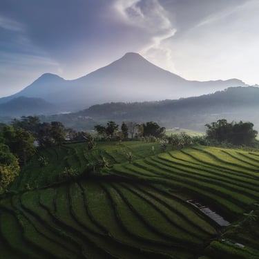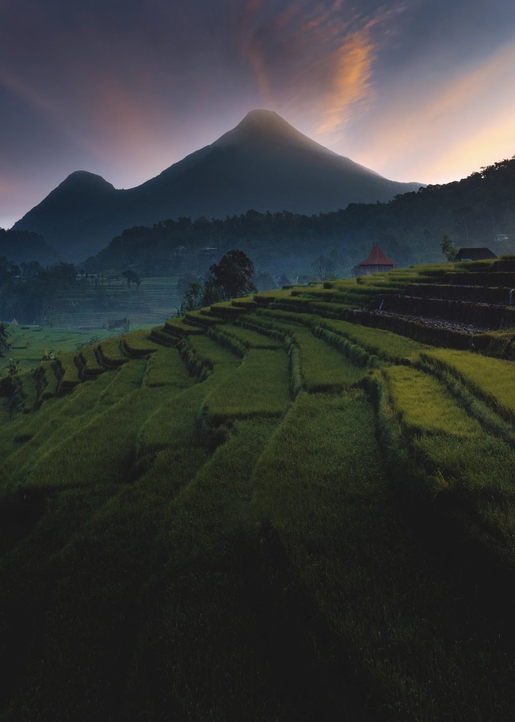 Sunrise at Selotapak reveals layered rice fields under soft light.
