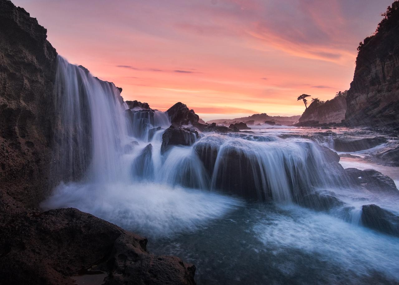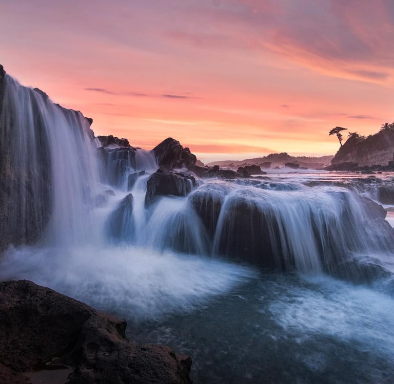 At Madakaripura, the landscape closes in—towering cliffs and falling water create a vertical, enclosed space. Light becomes softer, more diffused.