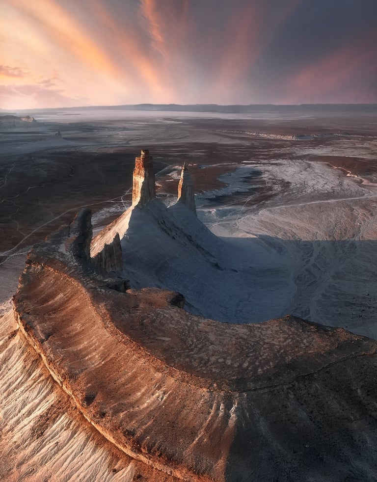 This journey takes you deep into the vast expanse of the Ustyurt Plateau—a land shaped by time, where dramatic canyons, towering chalk cliffs, and alien-like rock formations create scenes that feel far beyond Earth.