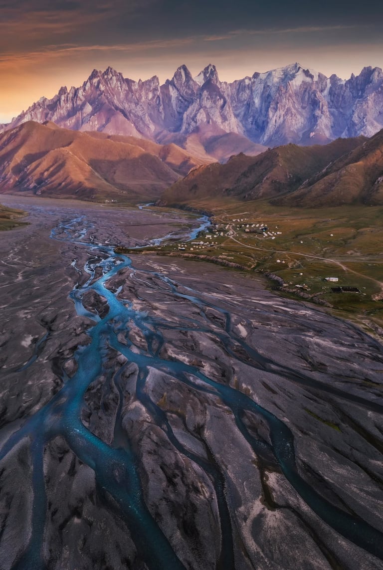 As you approach Kok-Kiya Valley, you reach the Kel-Suu River—your location for the sunset session. Surrounded by open landscapes and distant mountains, the river becomes a natural foreground, reflecting the soft evening light and adding depth to the scene from a photography perspective.